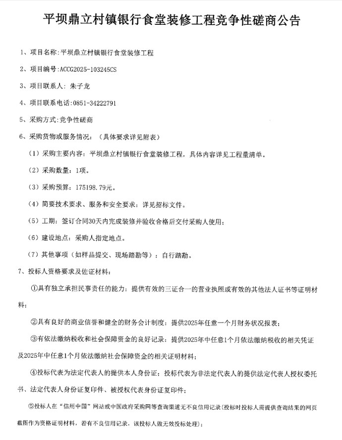 平坝鼎立村镇银行食堂装修工程竞争性磋商公告